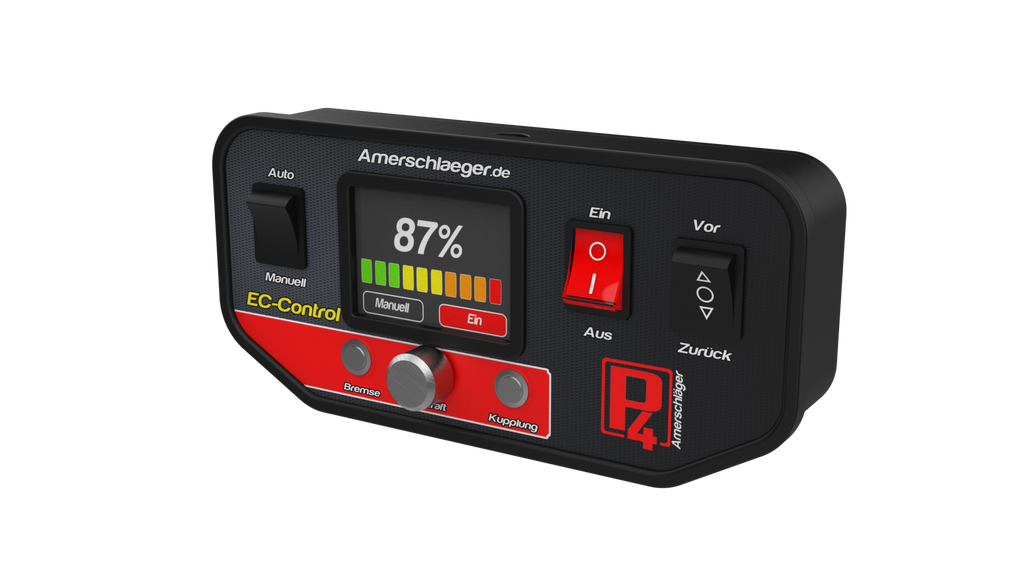 Die P4 EC-Control Einheit ist die zentrale Bedieneinheit des Prüfstandes. Mit ihr kann der Prüfstand und insbesondere die Wirbelstrombremse direkt vom Motorrad aus gesteuert werden. Das moderne Design beinhaltet ein 3,5 Zoll Display, auf dem der aktuelle Modus und die aktuelle Bremskraft grafisch und in Prozent dargestellt werden.